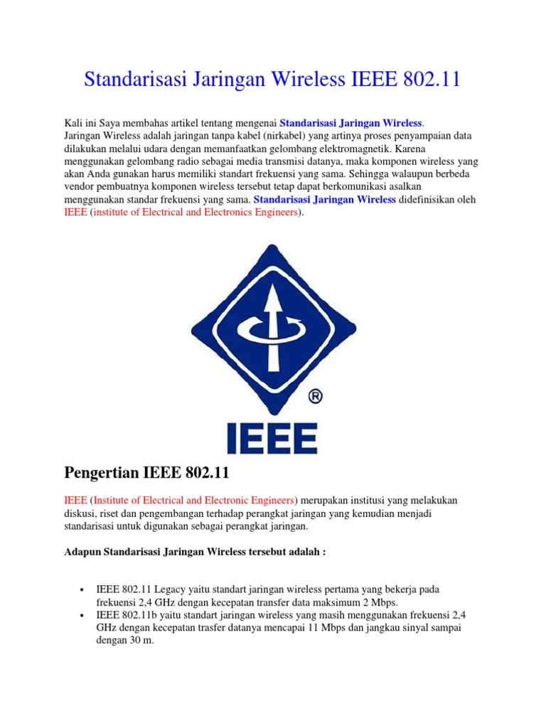 Wifi merupakan salah satu aplikasi pengembangan wireless untuk komunikasi data. Berdasarkan spesifikasi ieee 802.11 n yang berada pada frekuensi 2.4ghz. Standar ieee 802.11a merupakan protokol jaringan wlan yang dipublikasikan pada tahun. 802.1 ig bekerja pada frekuensi radio yang sama dengan 802.1 lb dan kecepatan transfer datanya mencapat 54 mbps, sama dengan standar 802.11 a. 802.11n dan standar ieee 802.11ac.